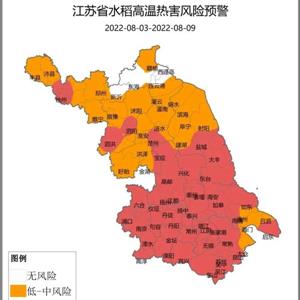 预计8月3-9日,苏南、江淮之间大部、淮北局部为水稻高温热害中—高风险区,其它地区主要...